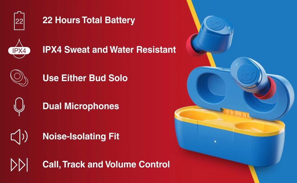 Skullcandy Jib (TWS) Bluetooth Truly Wireless in Ear Earbuds with 22 Hours Total Battery, IPX4 Sweat and Water Resistant, with mic, Noise-Isolating Fit, Call, Track and Volume Control (Black)